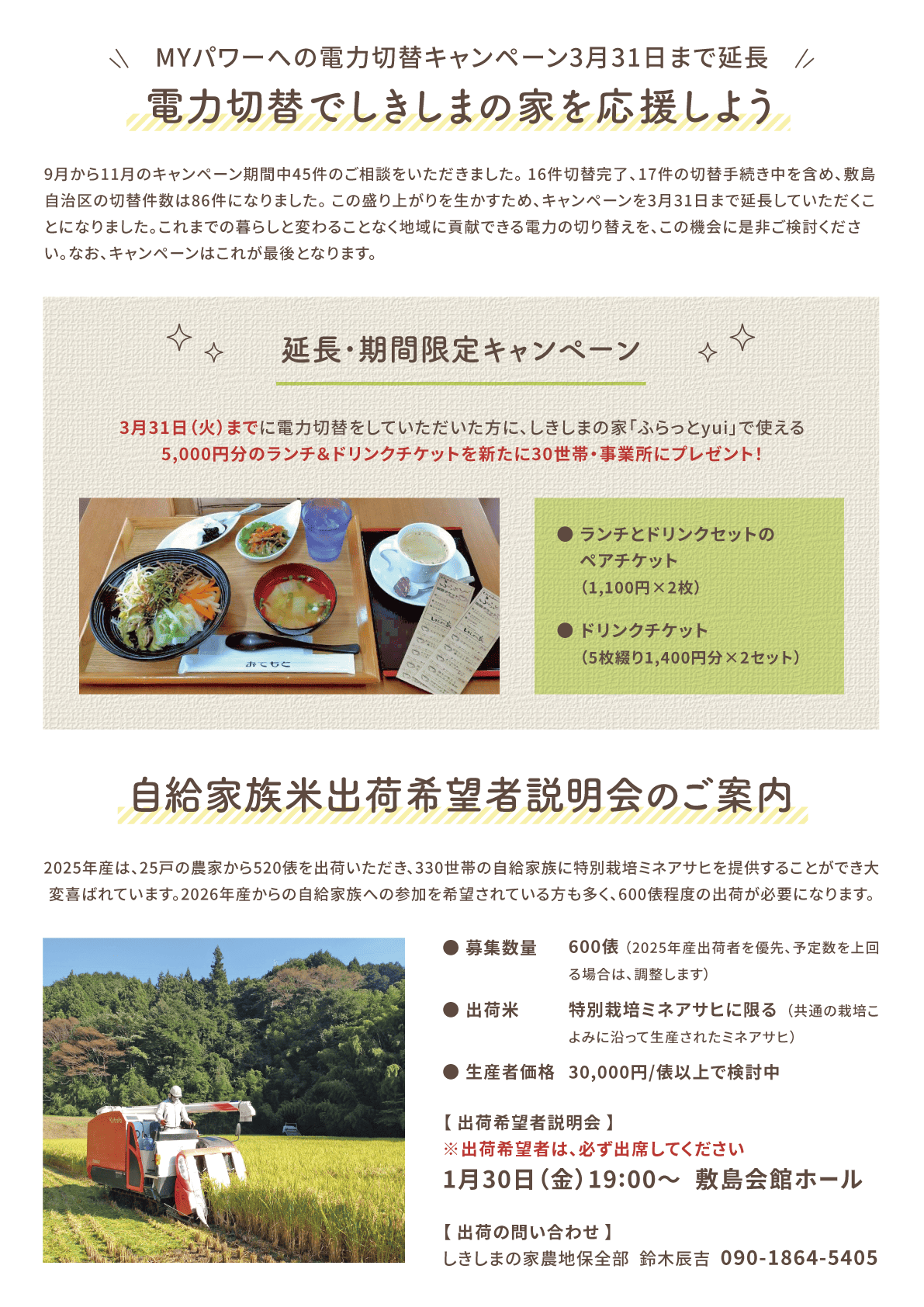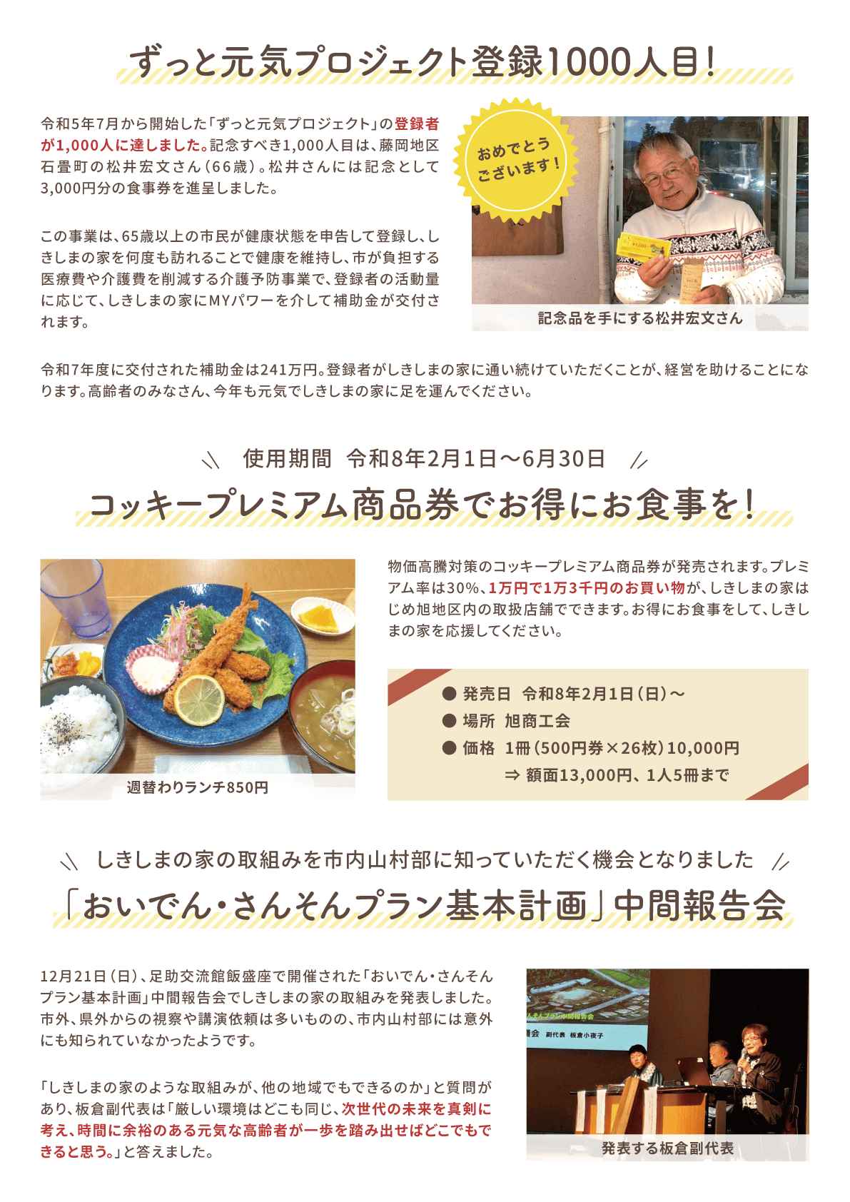 今月号では、しきしまの家と共に歩んできた旭中学校3年生による活動報告会の様子をはじめ、「ずっと元気プロジェクト」登録者1,000人達成のご報告や、プレミアム商品券、自給家族米出荷希望者説明会のご案内を掲載しています。